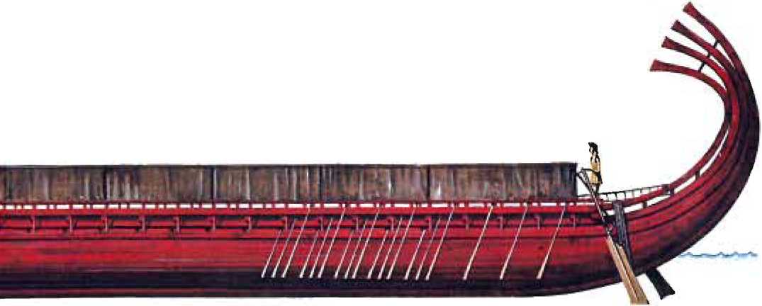 Здесь нам стоит на время остановиться и сказать пару слов о конструкции древних кораблей вообще и об особенностях боевых кораблей в частности. Торговые и транспортные суда отличались относительно большей шириной и, соответственно, вместительностью. Если корабль был загружен, то он шел ис па веслах, а под парусами, поскольку место гребцов в этом случае занимал груз. Б Греции такие корабли иногда назывались «круглымно. В противоположность этому, мы можем вспомнить о