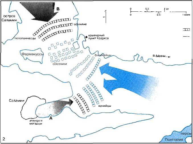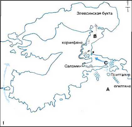 1 Греческое верховное командование передало ложное сообщение персидскому царю Ксерксу о юм, то греческая флотилия намеревается переместиться к Коринфскому перешейку и соединиться там с армией. Поверив в это. Ксеркс выслал египетскую эскадру для блокирования Мегарийского канала, а со стороны о. Псипалеи поставил в засаду свою флотилию, поджидавшую отступающих греков. Флотилия тщетно ждала всю ночь. Греческие флотилии вышли в море на рассвете и двинулись на север (В). Чтобы защитить Мепарийский канал и греков, эскадра Коринфа вместе с транспортными судами (они