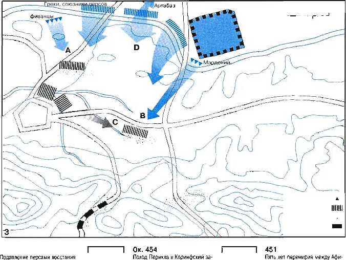 3 Мардоний идет в решительное наступление. Его кавалерия заставляет афинян повернуть назад. Союзные греческие войска бросаются на помощь афинянам, но их останавливают беотийцы (А|. Мардоний и его кавалерия оттесняют спартанцев к изгибу холмов (В); коринфяне и другие пелопоннесцы идут на подмогу (С). Персы выпускают тучи стрел в гоплитов, укрывшихся за щитами. Наконец, тегейцы идут в атаку, за ними следуют спартанцы. Вскоре мужественный опор персов сломлен тяжелой пехотой греков, Мардоний убит. Персидский центр под командованием Арташза держит Асоп-ский водораздел (0). наблюдая поражение персов, он отходит, преследуемый спартанцами. Беотийцы тоже отступили. В результате только 3000 из армии Мардония остались в живых, 1000 ионийских греков убиты. Греки потеряли от 1500 до 3000 воинов.