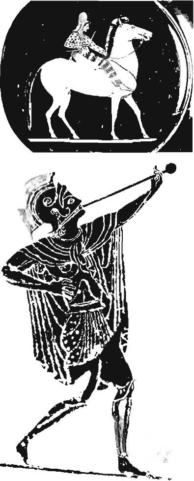(внизу). Изображение греческого военного трубача на винном кубке (килике). Такие сигнальщики были неитьелиемой частью греческих войск.