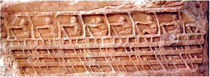 Для многих греческих городов-государств этого периода зашита, обеспечиваемая флотом Афин, по сути, превратилась в вымогательство. Тем не менее, афиняне вряд ли смогли бы обеспечить свои властные позиции, не имей они (поверху). Изображение триремы па мраморной пните (Ленорманский рельеф). Три ряда весел хорошо видны, ио можно разглядеть только один ряд гребцов. Такие боевые галеры могли полагаться в сражении на собственные весла.