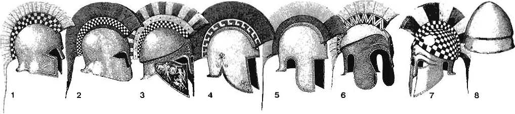 ции показаны шлемы, носившиеся в V в. до н.э. № 1 - скромно отделанный вариант коринфского шлема. Он обеспечивает хорошую защиту со всех сторон. но неудобен тем, что ограничивает поле зрения и слух, кроме того, он жаркий и душный, а следовательно, его нельзя носить в течение долгого времени. № 2 - южно-итальянский вариант, на основе которого развился эг-русско-коринфский тип (см. ниже). № 3 - типичный пример коринфского шлема, с удлиненными нащечниками для лучшей защиты лица и горла.