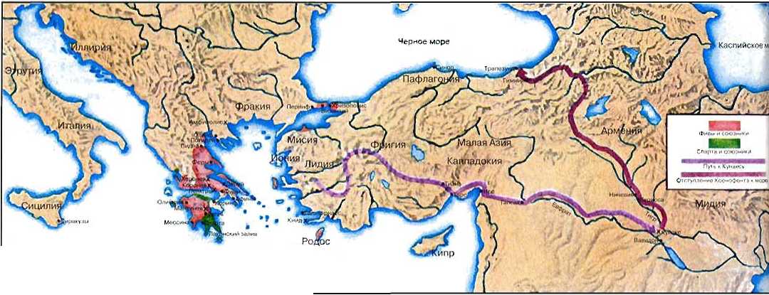 чем Киром, желавшим занять трон после смерти своего отца Дария II, в Персию. После гибели Кира в би гпе при Кунаксе близ Вавилона в 401 г. до н.э. его старший брат Артаксеркс П стал признанным правителем Персии. Что касается двух сатрапов, правивших восточными прибрежными областями Эгеиды. то они вновь начал гг плесг и интриги друг против друга. Этими разногласиями могли воспользоваться греки, жившие в восточных областях.