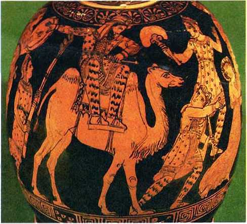 (справа). Персидский сановник верхом па верблюде. Персидская армия использовала в уппт период верблюдов. С ними приходилось обращаться осторожно, так как они часто расстраивали боевой порядок кавалерии.
