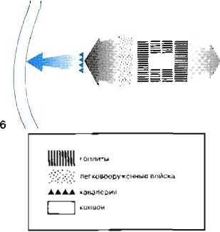 1 На схеме показано, как отряд пельтастов может защищать фалангу гоплитов от вражеских снарядов, в то время как фаланга разворачивается. Затем пельтэсты отходят назад и распределяются между шеренгами, стоящими в открытом порядке.