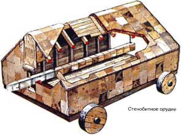 Таран применялся для частичного разрушения стен, чтобы через проделанную брешь е город могли ворваться войска. Приведенная на рисунке модель - так называемый таран-черепаха, широко использовался в IV в. до н.э. Передняя часть самого тарана покрыта металлическими пластинами, а зазубренный конец, как правило, был бронзовым.