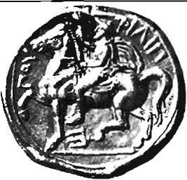 (вверху). Монета Филиппа И Македонского. На ней изображен сам царь Македонии. сидящий верхом на лошади. Эти монеты получили название *Филиппосы», что явтиось перефразированным греческим выражением, означающим «любитель лошадей».