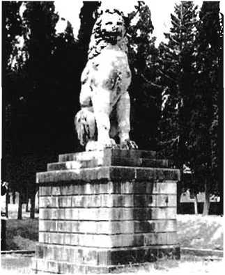 (справа). Памятник на месте гибели фиванцев в битве при Херонее.