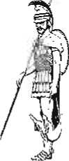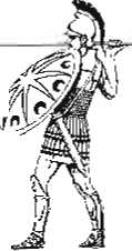 Внешний вид гипаспа до сих пор явля- $ ется спорным вопросом. Нам известно, что гипаспы формировали особый контингент в фаланге, но относительно обмун дарования гиласпов мнения расходятся. Во ин (слева) несет копье длиной 12 Футов (3,6 м) и щит, похожий иа те, что были недав но (в 1977 г.) найдены в гробнице Филип-