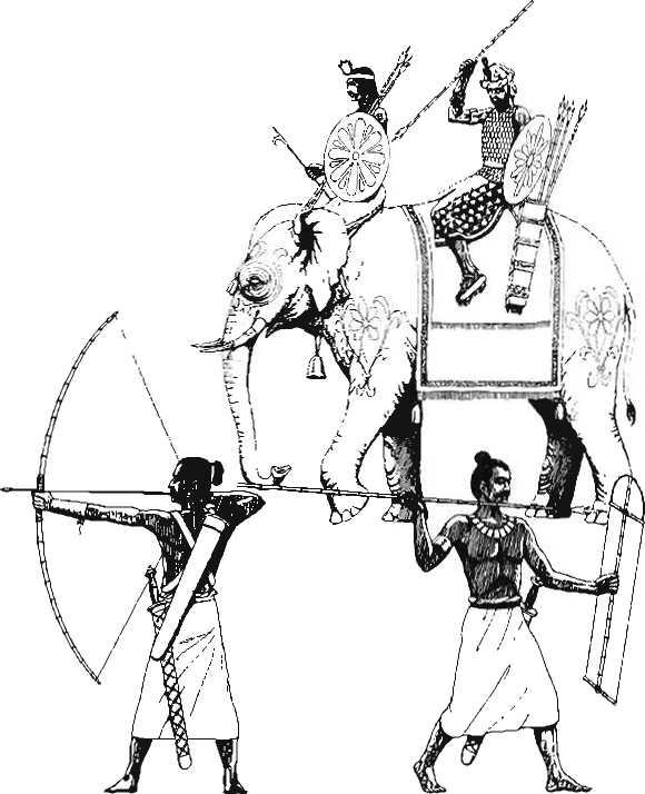Индийские воины На иллюстрации изображены войска, которые Александр разгромил у реки Гидасп. На боевом слоне едут мажут и раджа, вооруженные бамбуковыми кольями. Бивни слона усилены бронзовыми насадками. Главным оружием у индийцев был большой шестифутовый (1,8м) лук, стреляющий длинными (3 фута - около 1 м) стрелами. У длинного палаша (44 дюйма - 112 см) было очень широкое лезвие, палаш держали как одной, так и обеими руками. Щит был сделан из кожи.