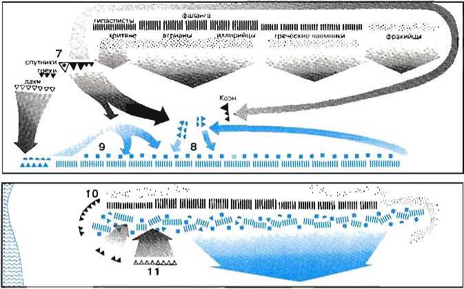 живается на острове (4) и двигается го берегу до тех пор, пока на годках не прибывает его фаланга. Кавалерия под прикрытием конных лучников (5) уезжает раньше, чем пор посыпает своего сына перехватить ее. Александр видит, что Пор не преследует его, и его кавалерия громит индийцев, чьи колесницы завязли в грязи. Здесь погибает сын Пора. Пор направляет свою армию против Александра, кавалерия которого маневрирует перед пехотой (6), давая ей возможность спокойно перестроиться. Пехоту Пора прикрывают слоны. Кавалерия Александра двигается вправо (7), в то время как Коен идет в обкод войска слева. Когда македонская конница наносит удар по индийскому левому флангу, Пор, чтобы поддержать его, направляет свою конницу с правого фланга, Коен преследует ее. Александр атакует, и индийская конница находит убежище среди боевых слонов (8). Греческая легкая пехота не дает ей похоя (9), остатки индийской кавалерии оттеснены назад Александром, когда она пытается атаковать его пехоту (10). Обьединившись вновь, кавалерия Александра атакует пехоту, как только с ней сближается фаланга. Вышедшие из повиновения слоны бегут прочь, кавалерия разбита и окружена сипами Кратера (11). Пор побежден, его потери огромны.