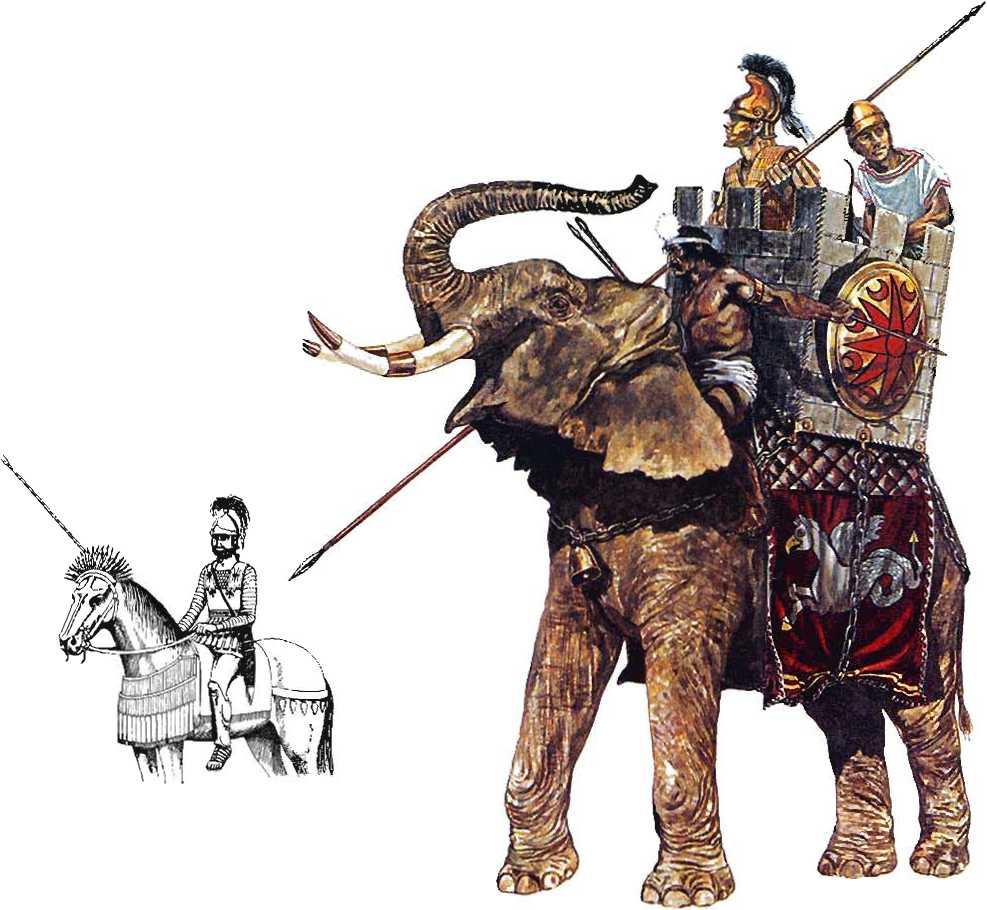 На Александра такое впечатление произвели боевые слоны Пора, чю он немедленно захотел включить згу единицу в свою армию; под командованием его преемников в военных действиях стали играть главную роль воины фаланги и боевые слоны. На спинах слонов стали устанавливать боевые башни, в которых обычно укрывались лучники или копьеносцы. Погонщик, чаще всего ицдиец, тоже был вооружен метательными копьями. Главными достоинствами слона в бою были его размер и тот ужас, который он вселял в души противника. Слоны особенно эффективны против кавалерии, гак как лошади, не привыкшие к ним, впадали в панику при виде их и услышав их трубный рев. Таким образом цепочка слонов с интервалом в 20 - 50 м могла легко блокировать надвигающуюся кавалерию. Однако и у слона был главный недостаток. Несмотря на го что убить слона было очень непросто. многочисленные уколы или потеря погонщика могли привести слона в бешенство. 8 этом состоянии он представлял одинаковую опасность как для войск противника, так и для собственных. Во избежание этого каждого слона сопровождал эс