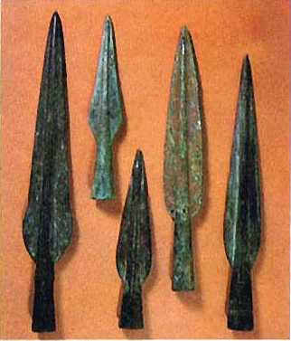 (справа). Италийские наконечники копий. Древко вставляется во втулку а наконечнике. я отличие от римских копий и дротиков более позднего времени, имевших черешковые, а не втульчатые наконечники.