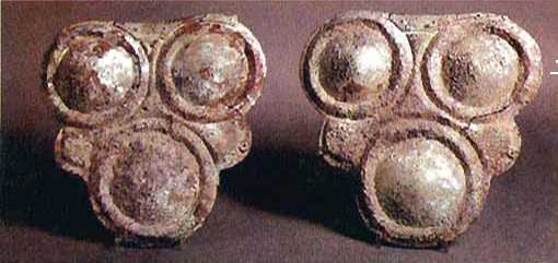 (справа). Такие самнитские нагрудные пластины с орнаментом в виде трилистника бьии широко распространены. Они обычны д.1н южной Италии IV в. до н.э.. примерно в то же время их заимствовали карфагеняне.