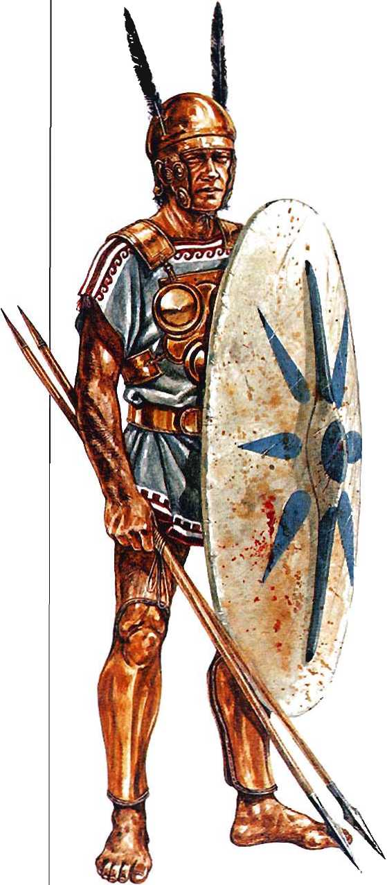 Когда власть Рима распространилась и на Италию, у него появились новые враги в лице италийских государств. Это противостояние усилилось во время интервенции Пирра из Греции. Одним из главных противников Рима были самниты, нанесшие Риму унизительное поражение в битве близ Кавдинского ущелья в 321 г. до н.э., когда римская армия была окружена и вынуждена капитулировать. Оружие и доспехи самнитов были весьма разнообразны. На цветной иллюстрации изображен типичный воин-самнит примерно 350 г. до н.э. Мы имеем хорошее представление о снаряжении самнитских воинов благодаря множеству сохранившихся настенных росписей в прибрежных городах. Снаряжение, изображенное на них, однако, более позднее и носит следы греческого влияния. Показанный здесь воин ближе к традиционному самниту. Самым необычным элементом его доспехов является нагрудная пластина из трех дисков, вероятно, развившаяся из более ранних круглых и квадратных пластин. Грудная и спинная пластины соединены плечевыми и боковыми -застежками». Другим распространенным типом были доспехи с квадратными передней и задней частями, декорированными под мускулы (как -мускульная» кираса). Широкий бронзовый пояс являлся символом мужества. Наголенники тоже применялись достаточно часто. Шлем модифицированного эпического типа имеет нзщечные части, имитирующие кирасу. Оружием воину служила пара копий. Кроме того, воин держит в руках традиционный длинный щит (скут). Самниты не знали мечей до тех пор пока греческие прибрежные города не оказались во власти самнитов, и две культуры смешались.