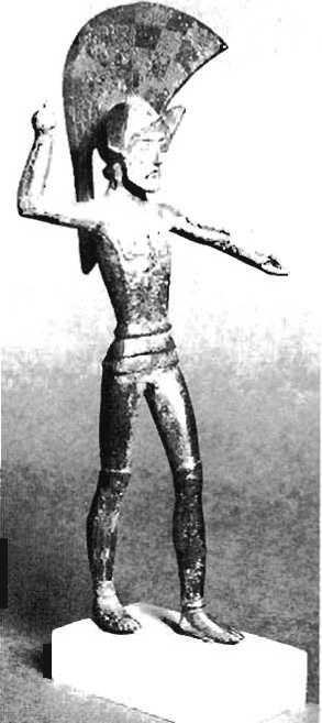 (слева). Этрусская бронзовая статуэтка У в. до н.э. Нащечиики шлема, как часто изображается на этрусских статуэтках. подняты вверх. Сравните их со опущенными греческими нащечниками.