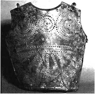(наверху). Италийская бронзовая грудная пластина с подобием пряжек. Отделка ранних италийских доспехов и оружия часто отражает влияние греческой культуры.