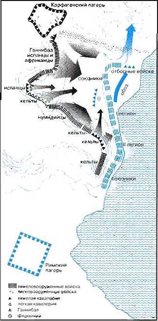 Римский консул Флэминий следует за Ганнибалом с намерением зажать его между своей армией и другой консульской армией. Но он ставит свой лагерь слишком поздно. Ночью отряды Ганнибала залегают на покрытых лесом вершинах вокруг озера. Ганнибал планирует устроить массовую засаду. На рассвете Фламиний собирается продолжить «преследование». На долину опустился густой туман. Первые рады' сталкиваются с отрядами легкой пехоты Ганнибала и развертываются, готовые к бою. Так же поступают стоящие позади когорты правого крыла. Задние ряды римлян по-прежнему находятся в узком пространстве между холмами и озером, под напором кельтских воинов они вынуждены отойти прямо в озеро. Группа римлян вокруг Фламиния застигнута врасплох и не успевает перестроиться в классические три линии. Фламиний убит кельтской кавалерией. Легкие войска Карфагена не могут противостоять римской пехоте, но они пробивают себе путь на гору Кастеллучио и тем спасают себя. Сражение длилось лишь три часа. Около 15 000 римлян пали в бою, около 4000 взяты в плен. Около 6000 воинов, которым удалось бежать, окружены карфагенянами и вынуждены сдаться. Потери Ганнибала со.пи в размерах европейским паруемым судам позднейших времен. Принято считать, что в Первой Пунической помпе Рим располагал 160 кораблями, у карфагенян же их было всего 130. Обе стороны были ограничены в своих строительных программах возможным количеством гребцов. Вероятно, своим превосходством римляне и н дампом случае были обязаны грекам.