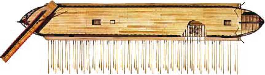 Для юго чтобы установить осадные башни, корабли сцепляли попарно. На рисунке (слева) показана осадная башня, водруженная на две «пятерки», Македоняне и римляне также устанавливали большие катапульты на свои корабли (в 251 и 213 гг. до н.э. соответственно).