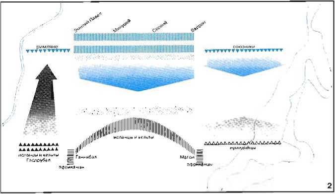 2 Сталкивается римская и карфагенская тяжелая пехота. Римляне оттесняют солдат Ганнибала на задние ряды, которые не желают отступать. Разъяренные кельты и лигурийцы обходят фланги и атакуют центр