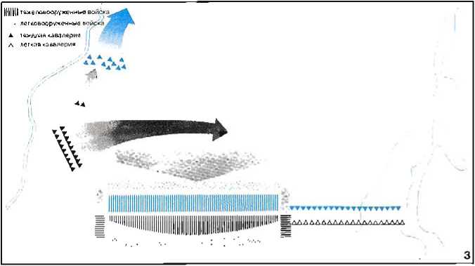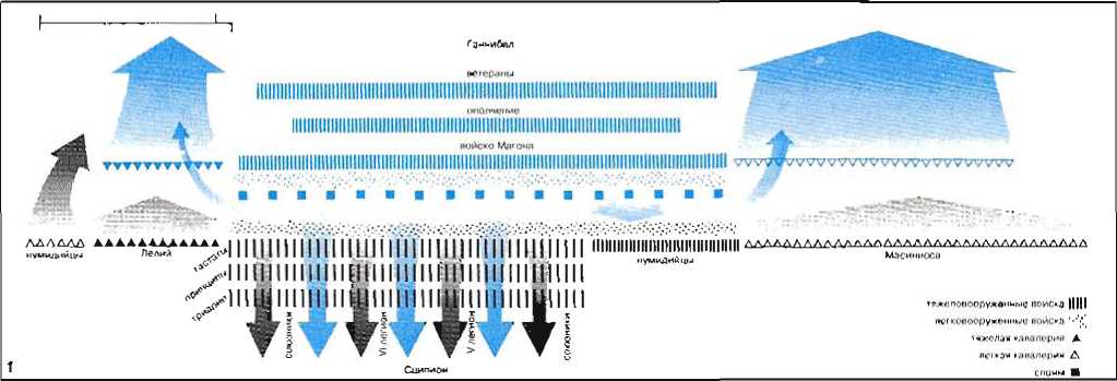 1 Легкая кавалерия ведет перестрелку. Атакующие слоны напуганы дикими криками римлян, они становятся неуправляемыми и, в свою очередь, пугают лошадей Ганнибала. Римская кавалерия пользуется этим и вытесняет противника с поля. Оставшихся слонов римские велиты загоняют в канавы.