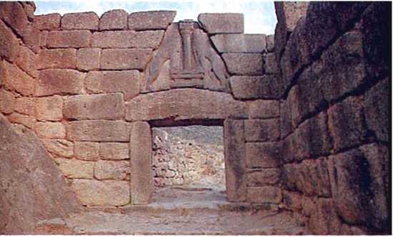 Знаменитые «львиные ворота» в Микенах. Прямоугольные блока ворот и степы рядом с ними контрастируют с грубо обработанными многоугольными блоками, т которых сложены другие части стены.