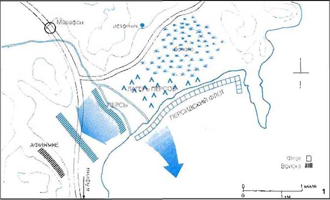 2 Греки быстро пересекают равнину, на расстоянии полета стрелы от персидского фронта они переходят на бег и атакуют. Персы были поражены подобным -безрассудством". Греческие фланги разбивают стоящих на флангах персидских союзников, ионийские греки в центре сражаются неохотно и дают им прорвать строй. Но и греческий центр в свою очередь не выдерживает персидской контратаки. В этот критический момент положение спасает дисциплинированность афинского войска. Отряды на флангах воздерживаются от преследования бегущего противника и направляются к персидскому центру, пытаясь взять его в клещи. Персидский центр смят, но многим персам удается добраться до своих судов. Остальных загоняют в близлежащие болота. Греки захватывают семь судов противника.