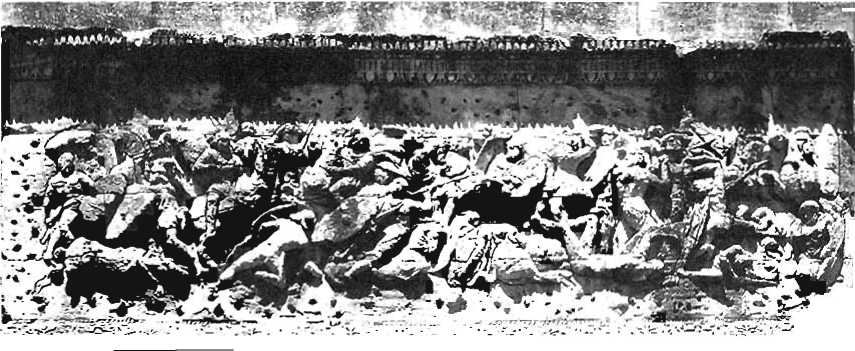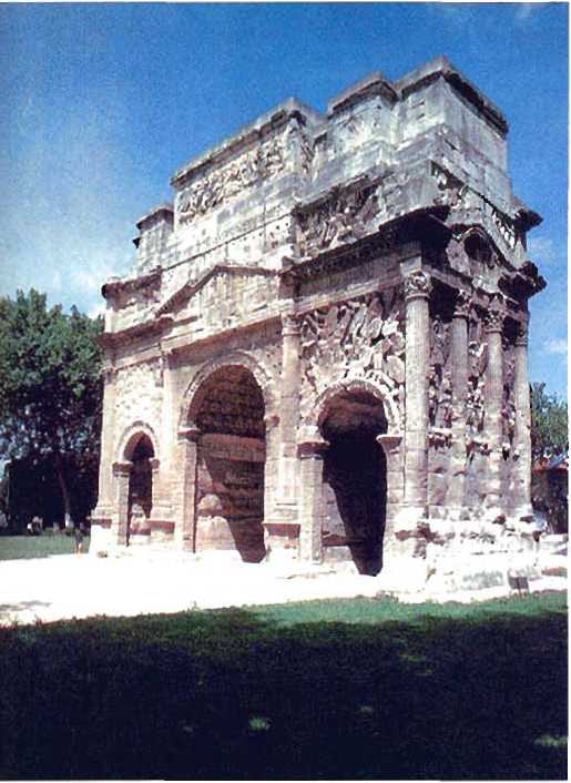 Построение войска в два или три эшелона диктовалось, в основном, характером местности. В битве Цезаря против союза племен белтов, происходившей на равнине, римляне развернули войско в боевую линию параллельно валу их собственного полевого лагеря. Но в сражении с превосходящим численностью неприятелем всегда есть опасность попасть в окружение, поэтому Цезарь не только ра змешал, как обычно. конницу на фл а! I гах. но и ста рался возвести полевые укрепления. В боях проз ив конфедерации племен белгов он всякий раз прикрывал оба фланга своей армии флешами и земляными валами. Такгическая фортификация. несомненно, была самой яркой чертой ри мско] о военного искусств;! в первом веке до нашей эры. Цезарь привнес в се развитие немало новшеств, и се эффективность обеспечивалась исключительно слаженными действиями его инженерных войск. Для примера можно упомянуть (слева). Триумфальная арка а А решают-, где римская армия была разбита германскими /теменами в 105 г. до и.з. Гельветы — противники Цезаря в 58 г. н. э., - были союзниками германцев.