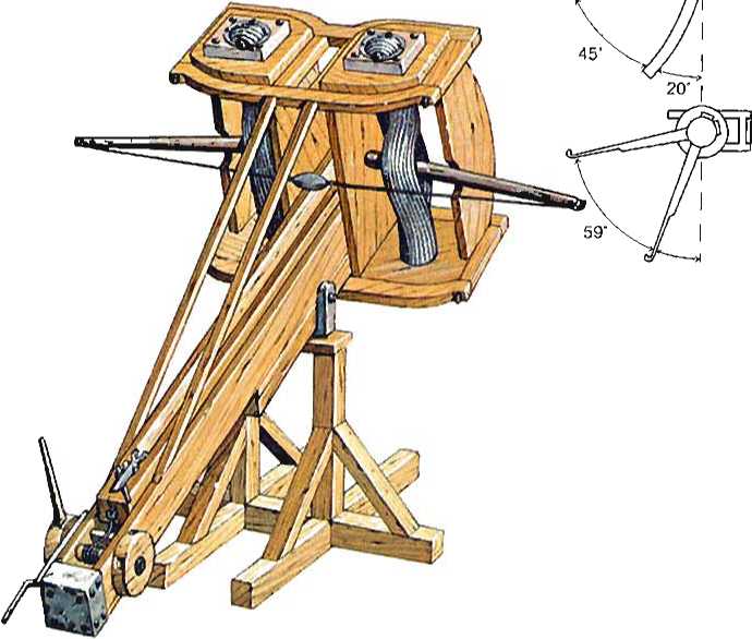 На схеме (слева) снизу вверх изображены греческие стреляющие стрелами орудия, скорпион и хейробаллистра. Она показывает, как с усовершенствованием конструкции увеличивался угол поворота и, соответственно, мощность.