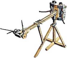 стрел. Следующим заметным усовершенствованием был переход с круглых отверстий и шайб на овальные. Это позволило использовать в конструкции больше веревок, натягивающих лук, не увеличивая при этом размеров всего орудия. Баллиста на рисунке изображена незаряженной. Чтобы запустить ее, следовало отвести ползун, так чтобы курок зацепил тетиву, а затем с помощью рычагов отвести назад собачку, удерживавшую тетиву до момента выстрела.