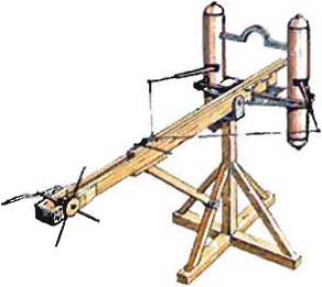 Баллиста (орудие, мечущее камни) Баллисту в деталях описал Витрувий, один из военных специалистов Цезаря, писавший около 25 г. до н.э. Баллиста, изображенная на рисунке, -наиболее распространенной конструкции. катапульта метала камни весом до 60 фунтов (27 кг). 8 более ранних конструкциях пружины были установлены немного под углом, в виде узкой «V». Это давало возможность менять угол стрельбы. Для такой системы требовался более сложный каркас, кроме того, она считалась непригодной для пускания