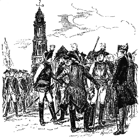 Здесь он сам подвергался всем опасностям, как в молодые годы, несмотря на то что припадки болезни сильно его изнуряли. Раз утром ему пустили кровь; в полдень услышал он перестрелку и поскакал на место битвы. В пылу сражения перевязка с руки его свалилась и кровь хлынула фонтаном. Сойдя с коня, он приказал первому попавшемуся ему на глаза лекарю перевязать ранку. В это время неприятельское ядро упало у самых ног его, завертелось и брызнуло вокруг себя песком. Лекарь с ужасом отскочил и затрясся всем телом. Фридрих улыбнулся и сказал окружающим: «Этот, должно быть, не много видывал пушечных ядер».