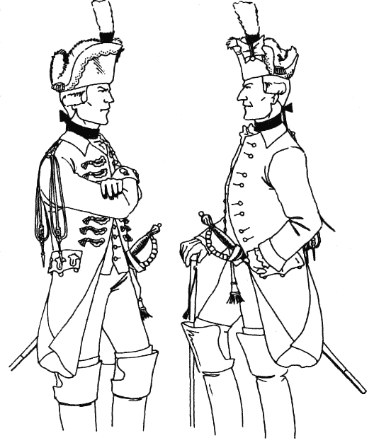 Обер-офицеры полка «Garde du Corps» в парадной (слева) и повседневной форме не для строя (1778 год). Парадная форма: синий мундир с красными воротом, фалдами и обшлагами. Галстук черный с белой манишкой. Жилет и рейтузы белые. По борту, обшлагам, карманным клапанам и спинке нашиты серебряные петлицы, пуговицы белые. На правом плече серебряный контрэполет с серебряным же двойным аксельбантом. Шпага пехотного образца с офицерским темляком. Шарф отсутствует. Шляпа — офицерского кирасирского образца. Повседневная форма: такая же, как и парадная, но без вышитых серебром петлиц. Контрпогон и аксельбант серебряные. Кроме того, в «Garde du Corps» существовал второй вариант выходной офицерской формы. Он полностью совпадал по покрою и деталям с вышеописанным, но имел красный цвет мундира с синими воротом, фалдами и обшлагами.