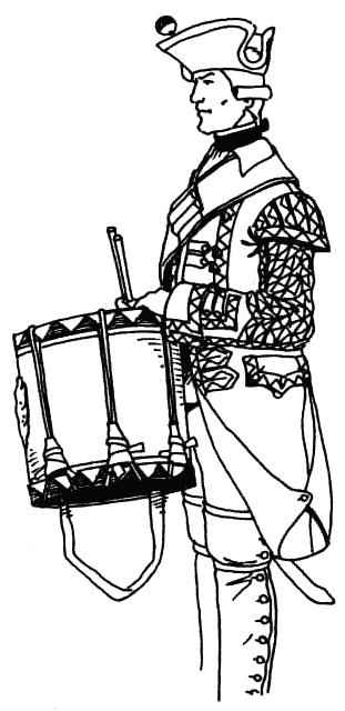 Барабанщик пехотного полка фон Мейеринка (1778 год). Мундир синий с красными обшлагами, фалдами, воротом и лацканами. Пуговицы и петлицы белые. Жилет и штаны желтые. Штиблеты черные. По рукавам, крыльцам, лацканам, карманным клапанам, обшлагам и над обшлагами нашит галун музыканта — белая тесьма с продольной красной «змейкой». Шляпа с белым галуном. Боковые кисти бело-черные. Кисть белая с красным верхом. Барабан цвета натурального железа. Полосы по верху и низу — бело-красные. Герб медный. Оплетка тесьмой и кожаные детали — белые.
