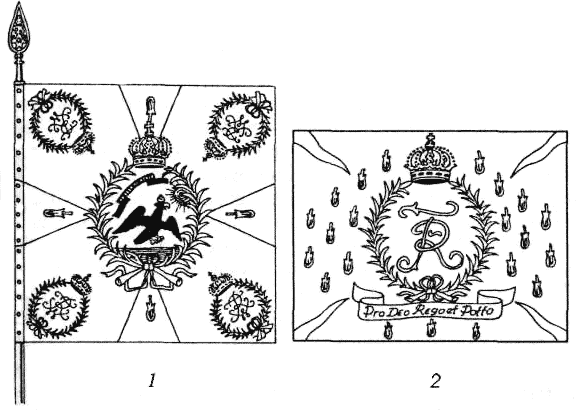 1 — «цветное» знамя пехотного полка (образца Фридриха Вильгельма I); 2 — знамя гарнизонного полка (образца Фридриха II).