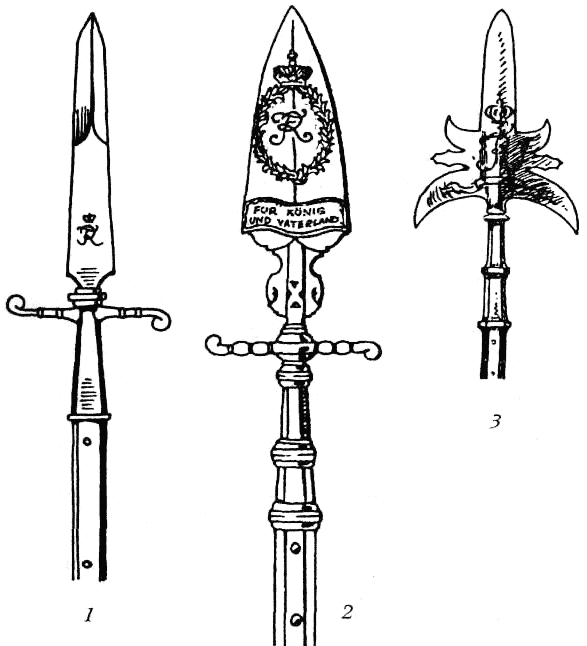1 — алебарда каптенармуса пехоты; 2 — офицерский эспонтон; 3 — прусская унтер-офицерская алебарда времен Фридриха II.