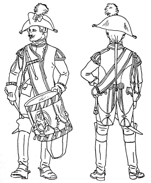 Барабанщик. Драгунский полк № 6. Черная треуголка с белым султаном и золотыми кисточками. Мундир темно-голубого цвета, приборный металл белый. Лацканы, обшлага, отвороты, камзол, аксельбант, ремень и перевязь белого цвета. Перевязь и крыльца с красными выпушками. Штаны и перчатки цвета лосиной кожи. Барабан кофейного цвета с красными полосами (вид спереди и сзади).
