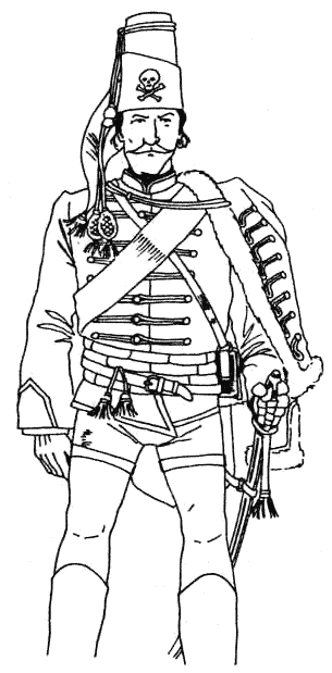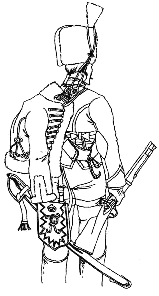 Рядовой Черного гусарского полка (1759 год). Доломан черный с черным воротом и обшлагами. Бранденбурги и пуговицы белые. По вороту и обшлагам, низу доломана и спинным вытачкам идет белый галун. Чакчиры черные, в верхней трети — палевые лосиные, в месте стыка нашит белый галун. Ментик черный с белыми бранденбургами и ментишкетным шнуром, мех черный. Мирлитон черный с белым рисунком, бельем этишкетом и белой кистью на крыле. Кушак красный с белыми перехватами и кистями. Перевязь карабина белая, остальная кожаная амуниция, чехол ташки и темляк сабли черные. Перчатки замшевые. Ташка (не показана) черная с красными «волчьими зубами» (окантованы с обеих сторон белой выпушкой) и белым вензелем.
