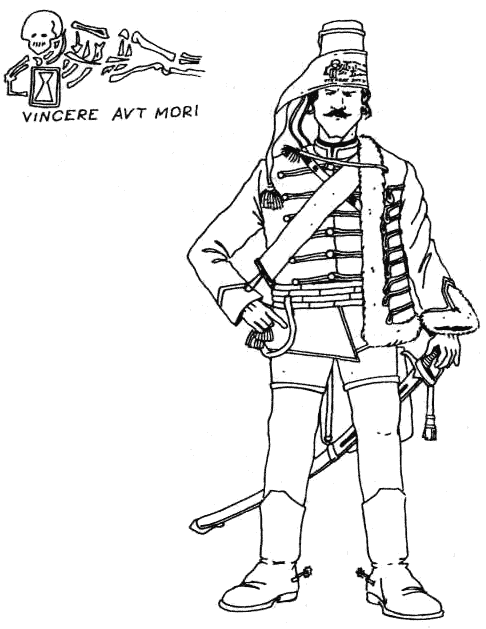 Бесспорно, самым известным гусарским полком прусской армии стал полк № 5 — знаменитые «черные гусары» фон Беллинга. Обмундирование включало черные доломан, ментик и чакчиры с желто-зеленой, а затем — красно-белой отделкой. Главным же отличием стала особая эмблема, которую носили на плисовых мирлитонах (гусарский головной убор). Налобной части мирлитона нижних чинов помещалось белое изображение лежащего скелета с песочными часами в руках. Рядом шел девиз: «Vincere avt mori» («Победить или умереть»). Впоследствии эту довольно тяжеловесную эмблематику заменило изображение «мертвой головы» со скрещенными костями. Столь зловещий внешний вид говорил отнюдь не о какой-то особой кровожадности «черных гусар», а всего лишь об их готовности отдать жизнь во имя победы. Однако их форма пользовалась некоей скандальной популярностью.