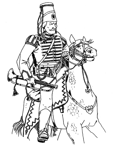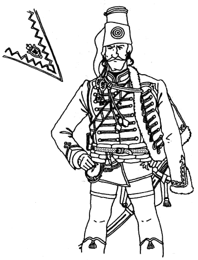 Трубач Черного гусарского полка (1759 год). Доломан, ментик, мирлитон — как у рядовых со следующими отличиями: бранденбурги, все мундирные галуны, кисти на кушаке, ментишкетный шнур-белые, затканные черной нитью (кушак красно-белый, как у рядовых). Чакчиры вместо черного сукна отделаны красным, в месте стыка нашит черно-белый галун. Мирлитон черный с черно-белой кокардой, белым галуном на крыле и черно-белым этишкетом (знаки отличия унтер-офицеров в гусарских полках). Крыльца на плечах черные с черно-белыми галунами. Конская упряжь черная. Чепрак черный с красными «волчьими зубами», окантованными с обеих сторон белым. Чемодан и свернутая епанча черные, сухарный мешок некрашеной парусины. Все чины полка ездили на белых или серых лошадях. Обратите внимание, что гусарские трубачи, офицеры и унтер-офицеры носят лядунку через левое плечо. Унтер-офицерский темляк на сабле — черно-белый. Труба медная с черно-белыми шнурами.