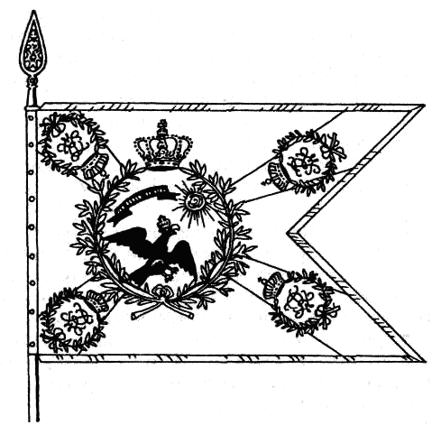 и переносили на новые полотнища, при этом королевский вензель Фридриха Вильгельма «FWR» заменяли на новый «FR». В отличие от кирасир (которые имели штандарты), знаменосец у драгун и гусар именовался фанен-юнкером.Знамя кавалерийского полка.