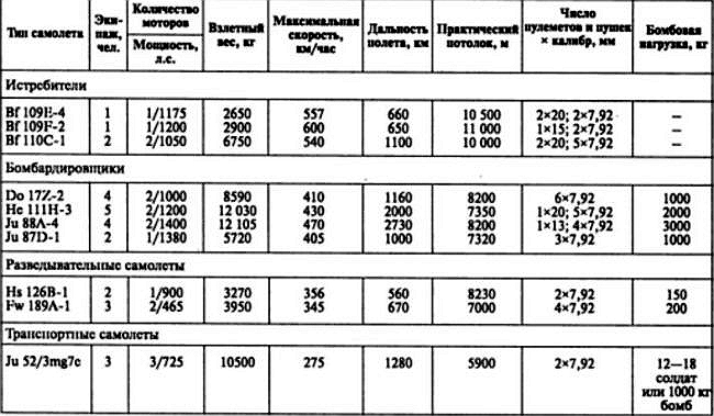 Таблица 1. Летные характеристики основных самолетов люфтваффе в начальный период Великой Отечественной войны.