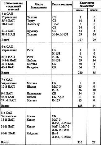 в полосе обороны 125-й стрелковой дивизии немцы бросили в бой сразу три танковые и две пехотные дивизии — фронт был прорван, и в образовавшуюся брешь хлынули и другие соединения вермахта. К середине дня немцы захватили Таураге, а к вечеру вышли на рубеж реки Дубисса. Все мосты достались им в целости и сохранности. Советские войска под ударами танков и авиации противника вынуждены были отойти на всем протяжении фронта на 20–40 км. Естественно, это поставило под угрозу захвата приграничные советские аэродромы, и авиационные части начали спешно перебазироваться на восток, в районы Елгавы и Даугавпилса.Таблица 9. Боевой состав ВВС Прибалтийского военного округа по состоянию на 1 июня 1941 года.