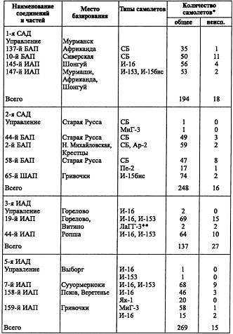 Ленинградским военным округом перед началом войны командовал генерал-майор А.А. Новиков. Умный, интеллигентный и порядочный человек, он пользовался большим авторитетом в войсках и особенно среди личного состава советских ВВС. По состоянию на 1 июня 1941 года, в ВВС Ленинградского округа числилось 1288 самолетов, из которых 214 были неисправными. Их распределение по соединениям и частям, а также места базирования приведены в таблице 7. Нужно заметить, что данные эти к началу войны несколько устарели, поскольку советская авиация находилась в стадии реорганизации (некоторые авиаполки только формировались), и за месяц многое могло измениться. Поэтому ниже приводится и общий состав.