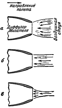 самолета:а— на стоянке или при полете с малой скоростью; воздух перед двигателем разгоняется, давление его уменьшается, б— при полете со средней скоростью, давление воздуха перед двигателем не меняется; в— при полете с большой (дозвуковой) скоростью; воздух перед двигателем тормозится, давление его растет