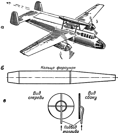 Конечно, при этих условиях никакой нужды в компрессоре для сжатия воздуха нет. Но что же останется от турбореактивного двигателя, если выбросить компрессор и приводящую его газовую турбину? Одна только камера сгорания в средней части длинной трубы. И вот эта примитивная топка превращается в замечательный двигатель, если она движется с огромной, сверхзвуковой скоростью. Такая «летающая топка» способна развивать колоссальную тягу, необходимую для осуществления скоростного полета, и расходовать при этом меньше топлива на 1 кгтяги, чем любой другой известный реактивный двигатель. Да и по весу вряд ли найдется другой двигатель, способный конкурировать с прямоточным — что может быть легче простой тонкостенной трубы!