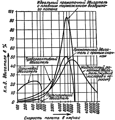 Из этого рисунка видно также, что предельной скоростью полета, при которой возможно применение прямоточного двигателя, является скорость, в 4—5,5 раз превосходящая скорость звука. Это и определяет область наивыгоднейшего использования прямоточных двигателей. Можно считать, что этой областью является диапазон изменения скорости полета от 2—3 до 4—5 скоростей звука.