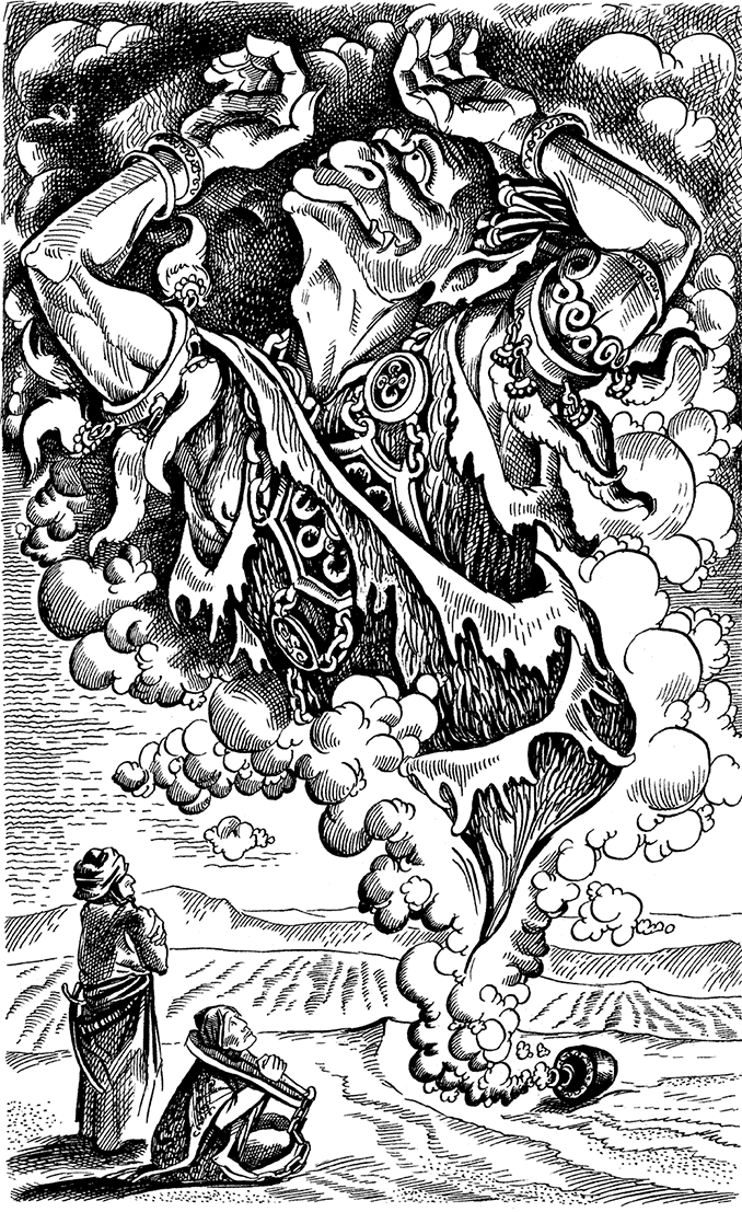 К этому времени все уже убежали, кроме Кабула Акбы и Абдуллы: Абдулла остался на месте потому, что в оковах не мог пошевелиться, а Кабул Акба – потому, что неожиданно оказался человеком бесспорно отважным. Джинн сердито уставился на них.