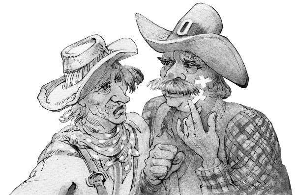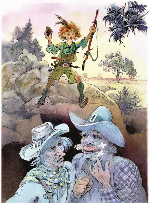 Смотрю, Билл заклеивает липким пластырем царапины и ссадины на своей физиономии. Позади большой скалы у входа в пещеру горит костер, и мальчишка с двумя ястребиными перьями в рыжих волосах следит за кипящим кофейником. Подхожу я, а он нацелился в меня палкой и говорит:
