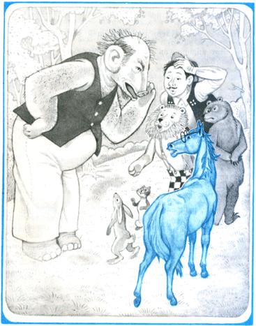 — Ну и размазни! — сказал он. — Храбрый лев Зигфрид Брукнер, гениальный заяц Аромо, голубой чудо-жеребец Серафим, сильный, как бык, Лайош Урод, знаменитая кошка Ватикоти и сама олицетворенная честность Бум-Бу-Бум, или как его там!